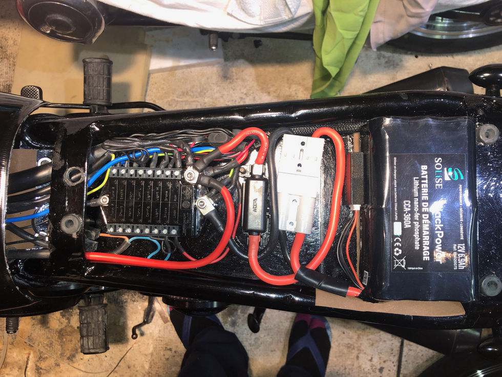 Sur le plan électrique, j’ai tout repensé : le faisceau d’origine a été remplacé par un M.Unit et des commodos MotoGadget. Tous les câbles sont discrètement passés dans le guidon pour un style épuré. Les clignotants à LED, le phare réduit à 5 pouces et l’instrumentation remplacée par un mini compteur multifonction viennent moderniser et simplifier la moto.